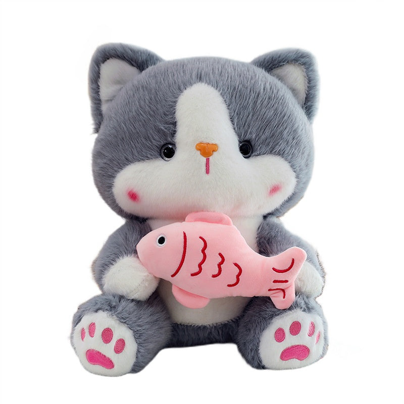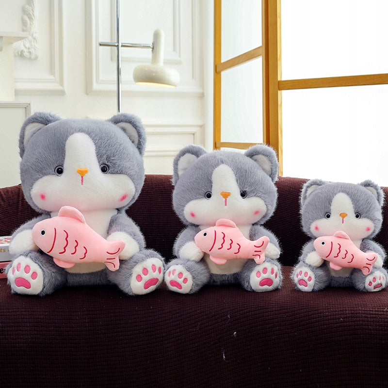 MASKOTKA PLUSZAK PRZYTULANKA KOTEK FUTERKO BIAŁO-POPIELATY Z RYBĄ XL 38 cm