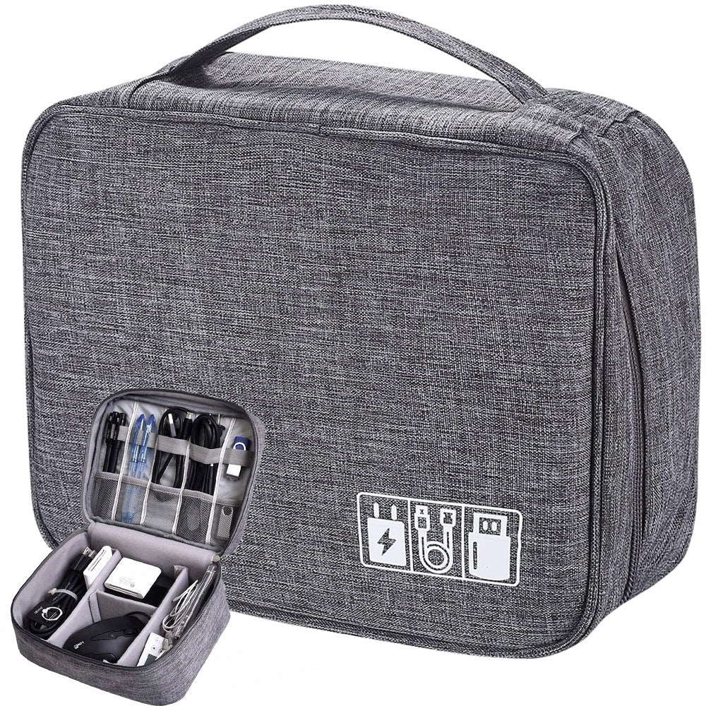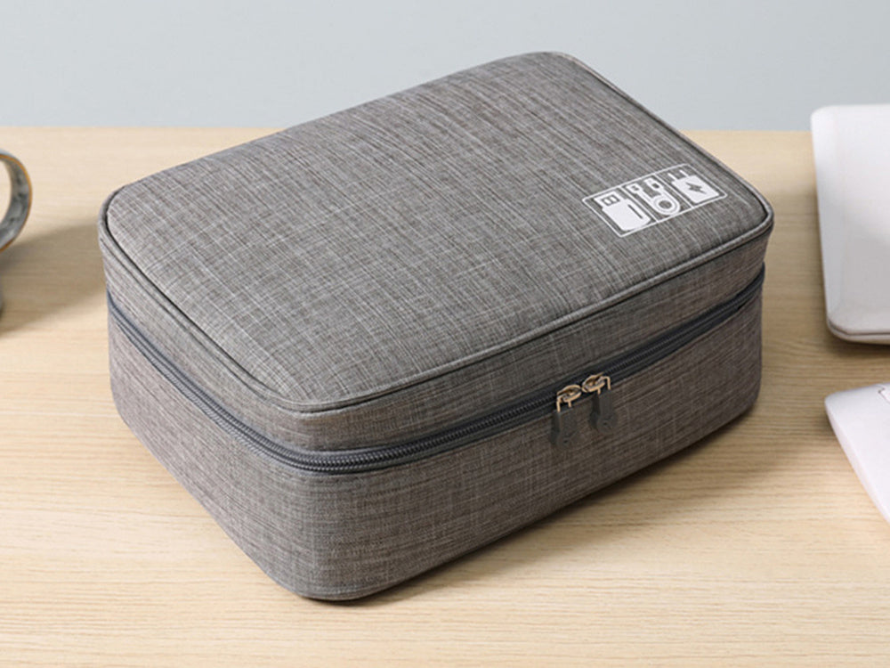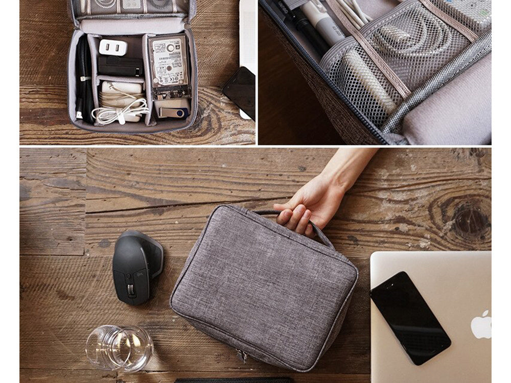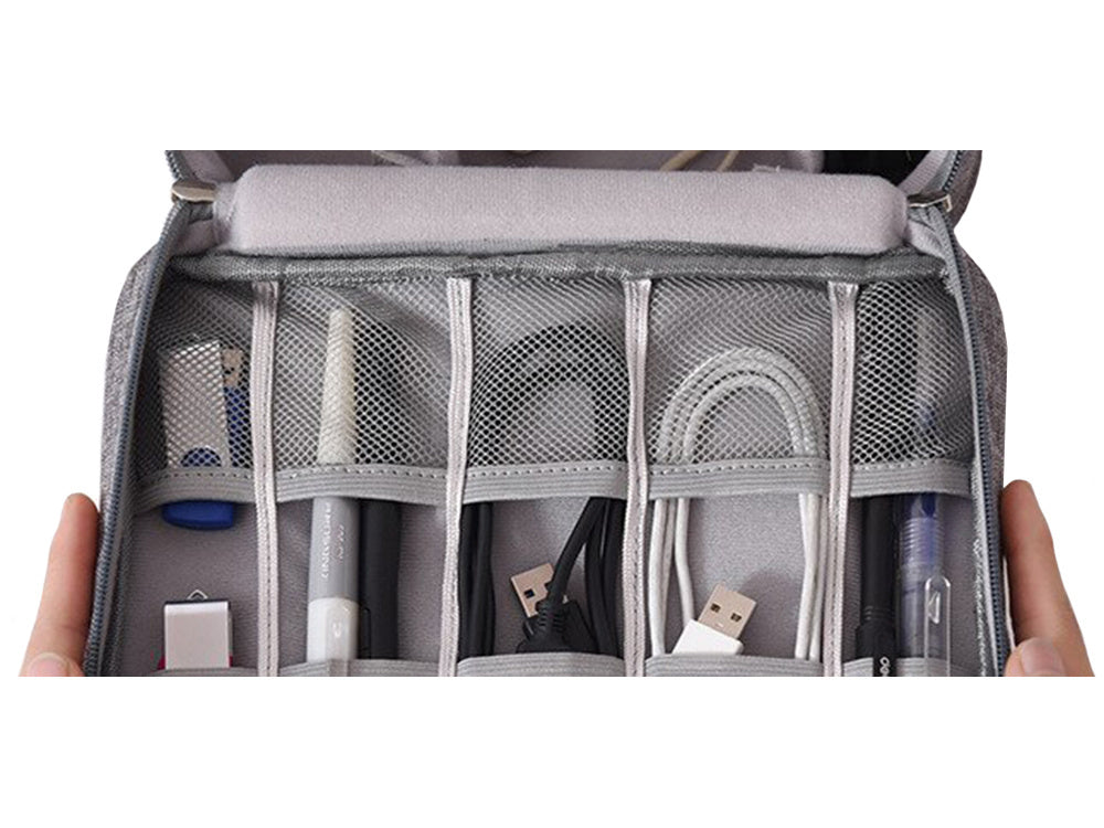 Organizer został zaprojektowany z myślą o funkcjonalności w trakcie podróży. Został wyposażony w wiele przegródek, elastyczne paski na kable oraz kieszonki na mniejsze akcesoria, takie jak kart pamięci, adaptery czy słuchawki. To wszystko sprawia, że utrzymanie porządku w Twoich elektronicznych przyborach jest proste i intuicyjne.