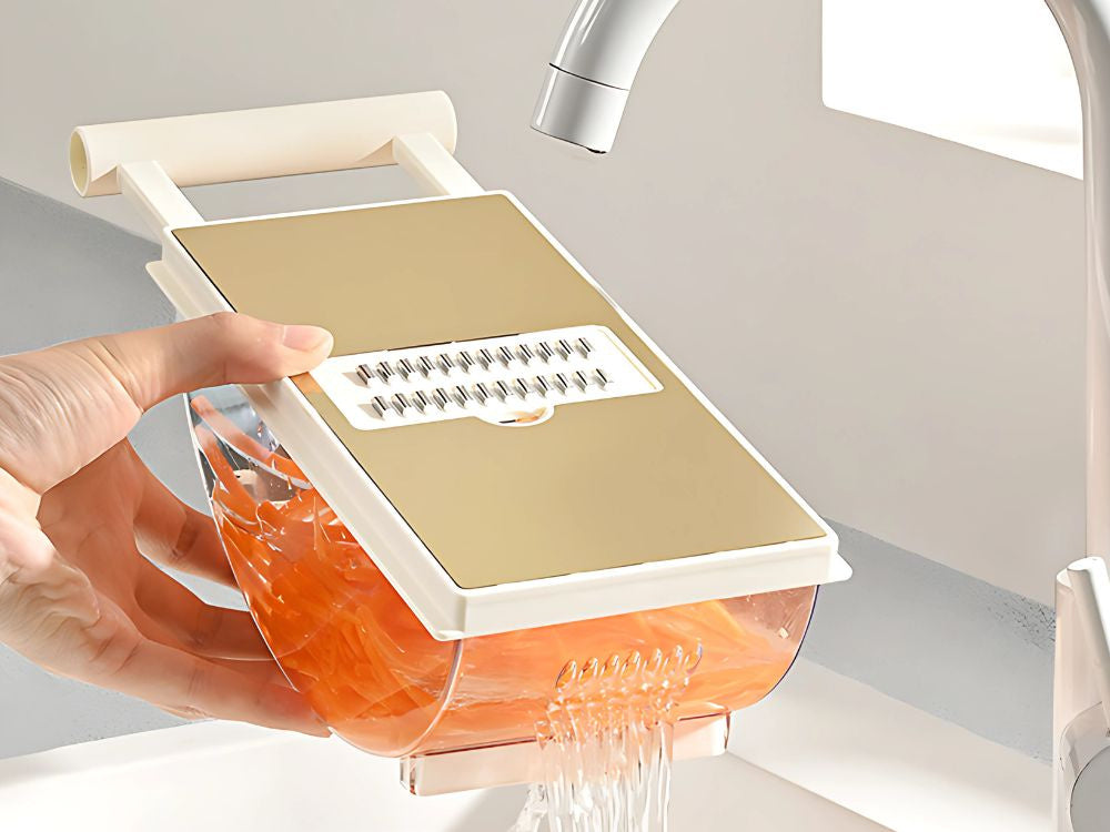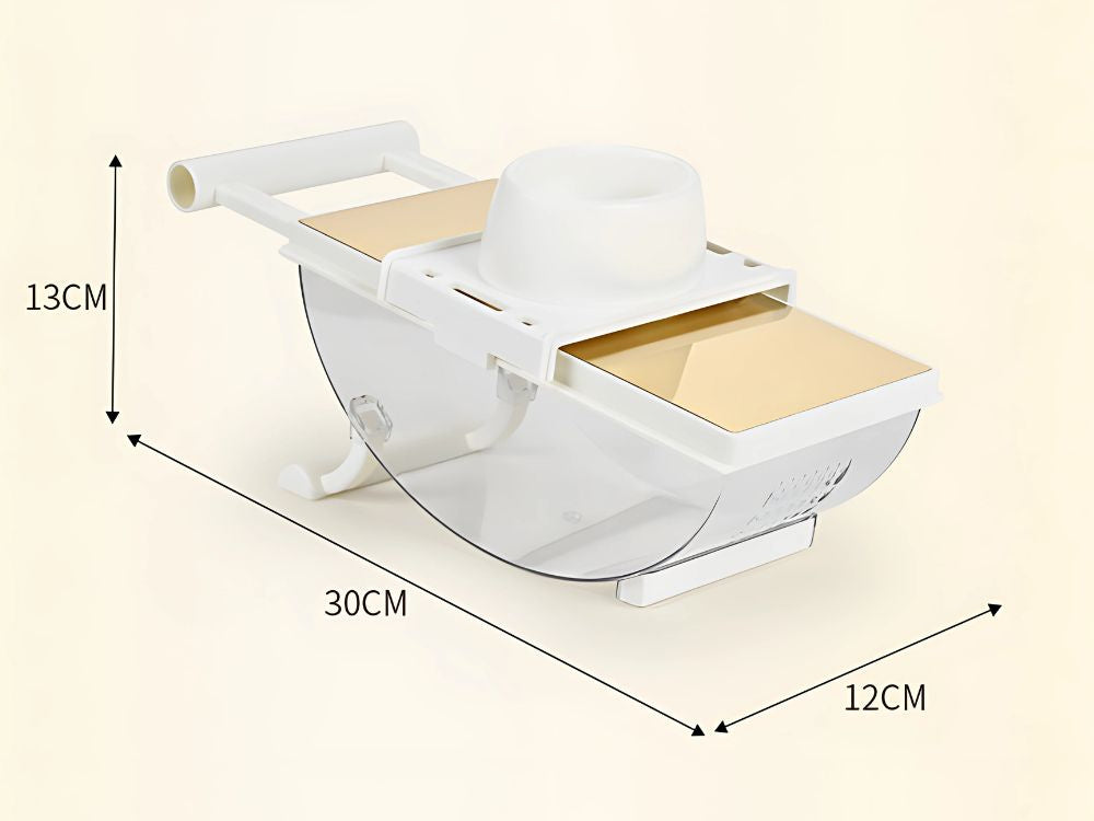 Szatkownica wyposażona jest w specjalny uchwyt ochronny na produkty, który chroni palce podczas tarcia i krojenia. Antypoślizgowa podstawa gwarantuje stabilność, a przezroczysty pojemnik pozwala na wygodne zbieranie pokrojonych składników bez bałaganu w kuchni. Konstrukcja jest lekka, a jednocześnie wytrzymała, co sprawia, że sprawdzi się w codziennym użytkowaniu.
